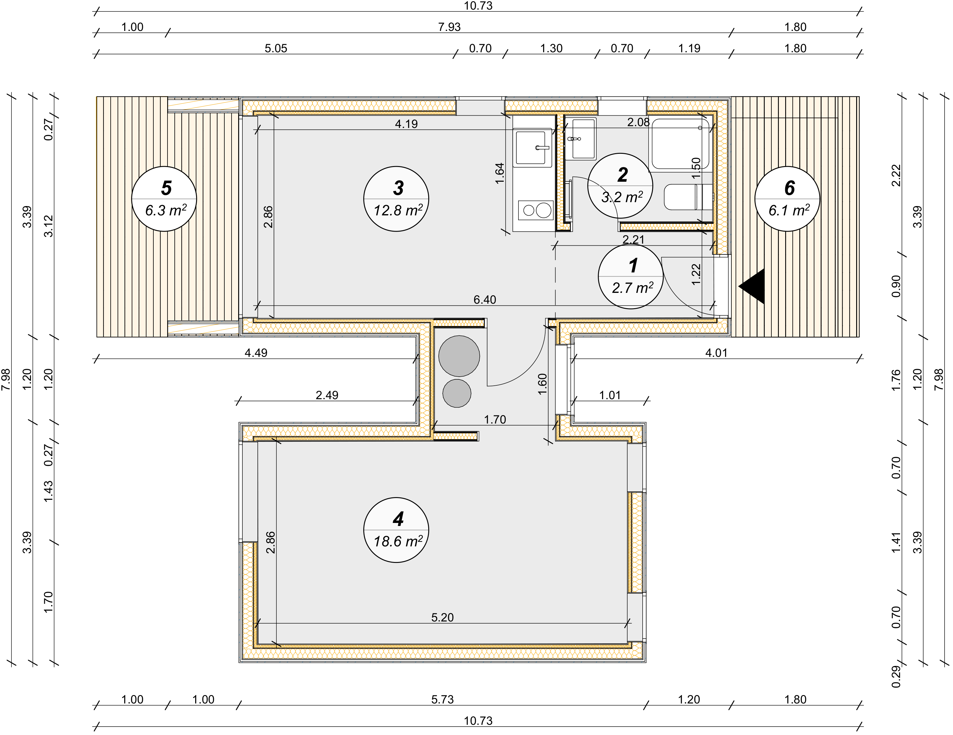 Die optimale Konfiguration ist für gemäßigte Klimazonen konzipiert, mit einem Gebäuderahmen, der 200 Millimeter Dämmung und eine innere Dampfsperre umfasst. Diese Konfiguration gewährleistet ein angenehmes Raumklima und unterstützt die strukturelle Integrität sowie die Langlebigkeit des Gebäudes.