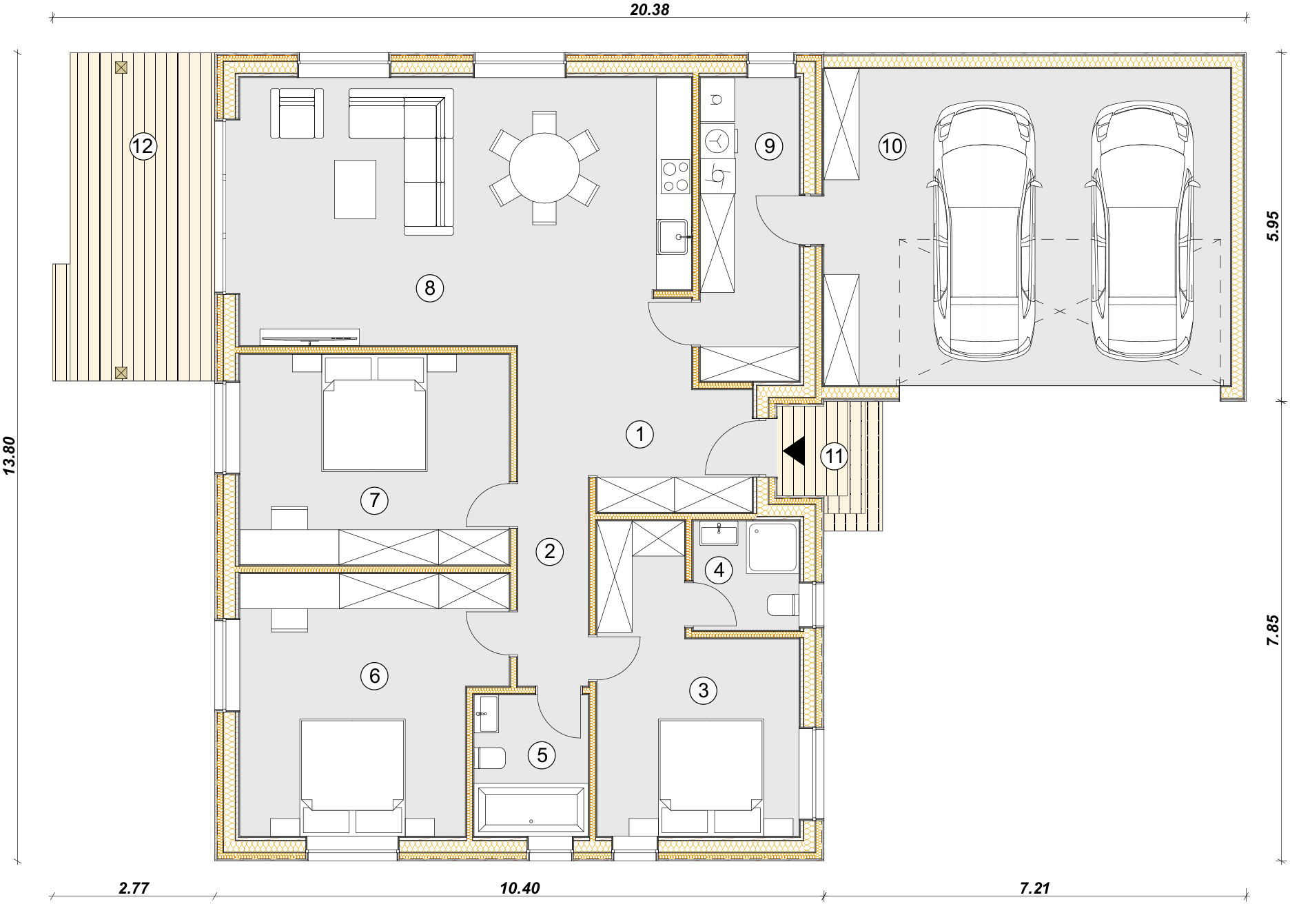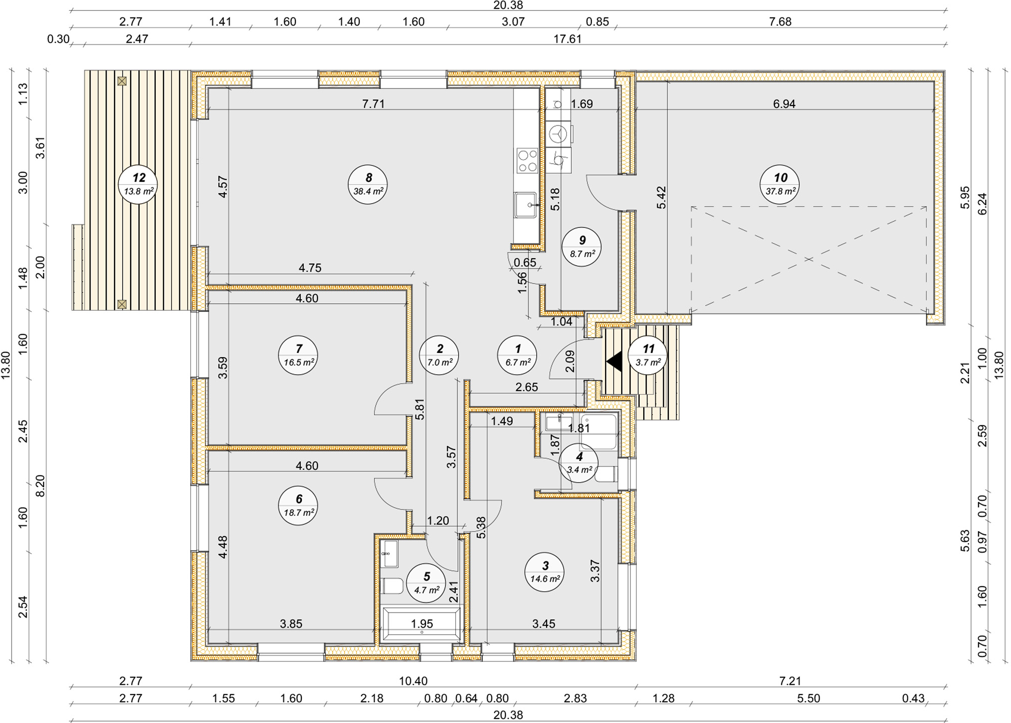 Het Hamburg model is een royaal, gelijkvloers familiehuis, gedefinieerd door zijn klassieke L-vormige ontwerp dat een gastvrije aanwezigheid creëert. Het hart van de woning is een grote open woonkamer van 38,4 m² die keuken, eet- en woonfuncties combineert en naadloos overloopt in een beschut buitenterras.