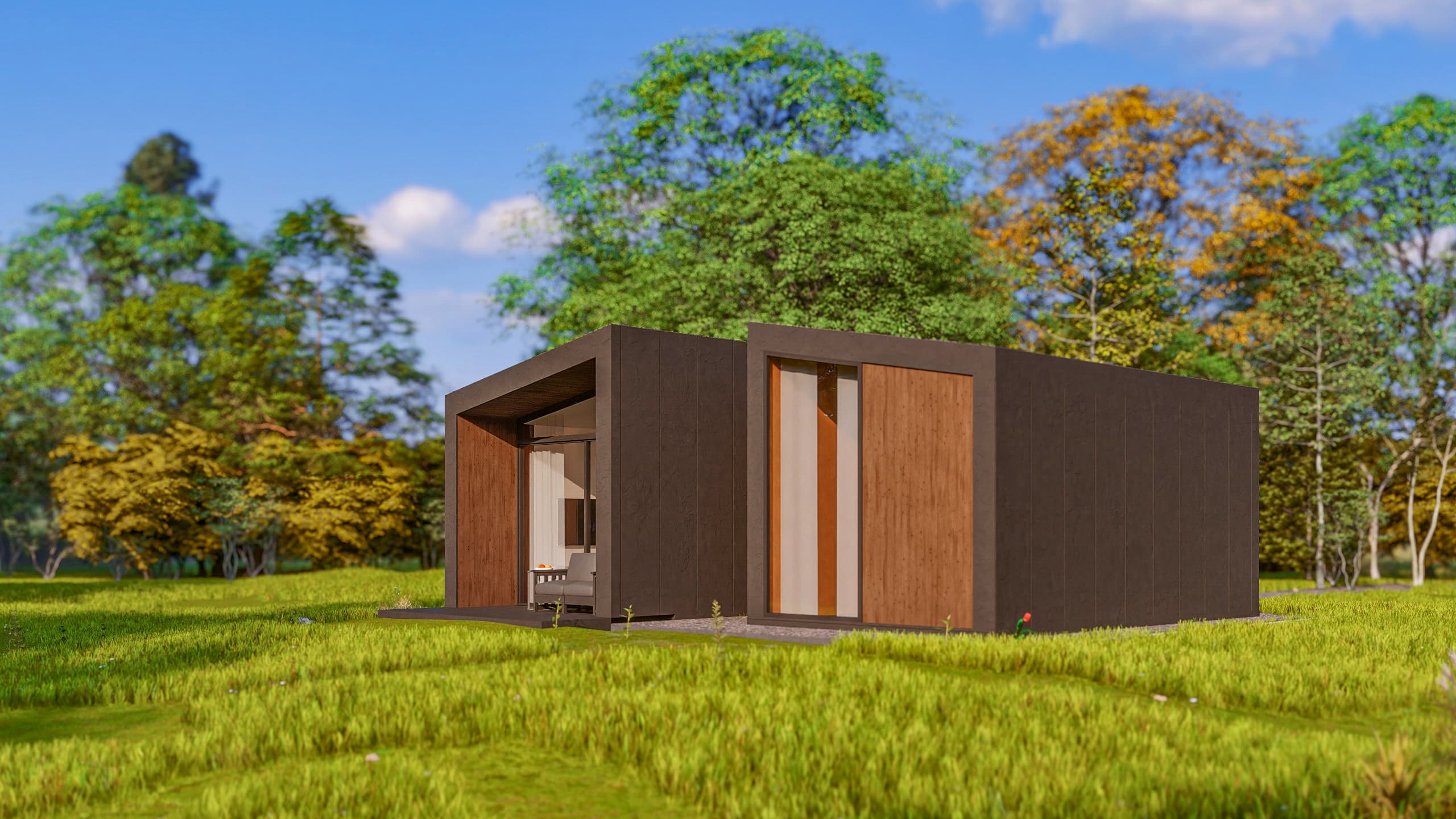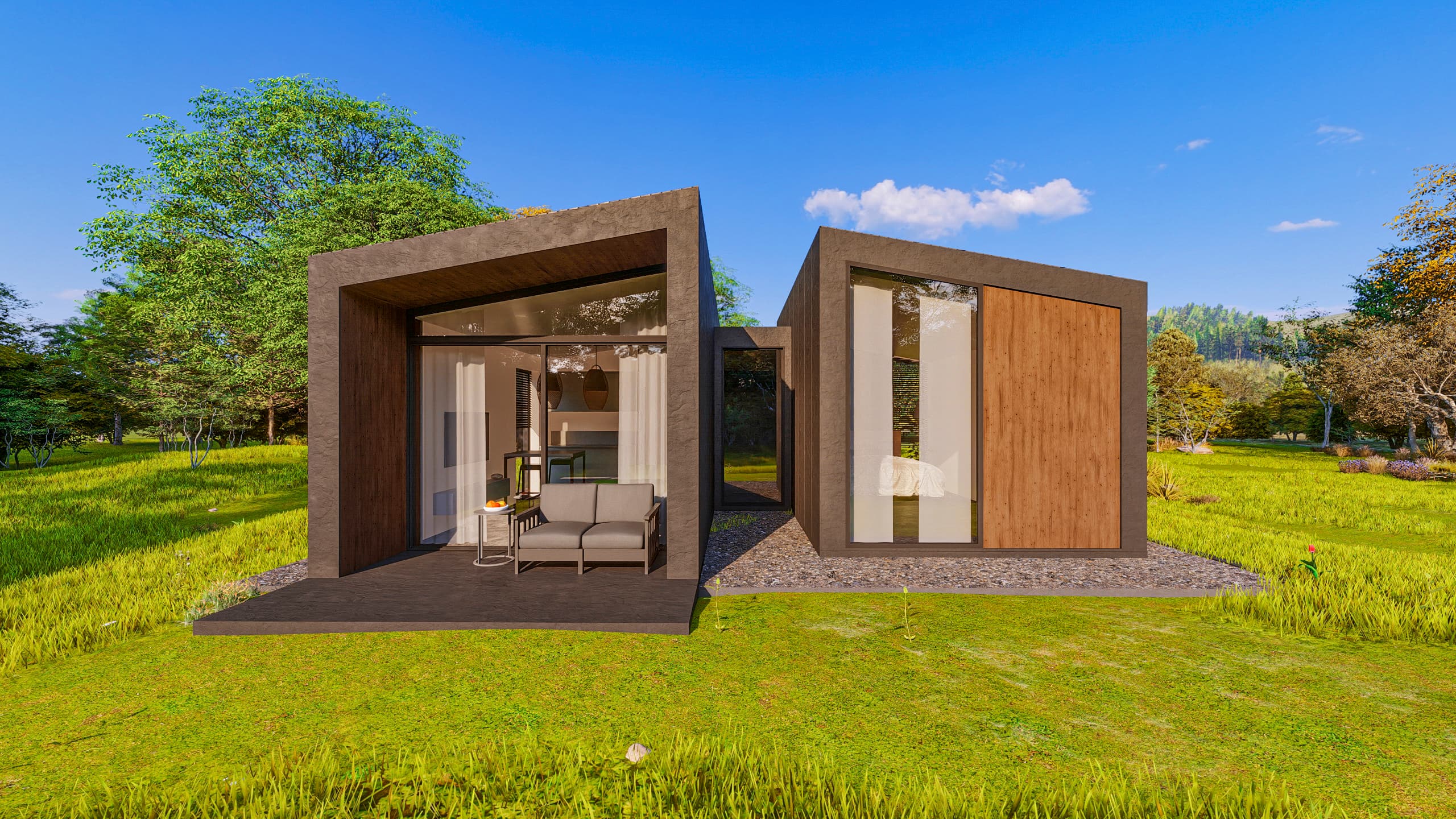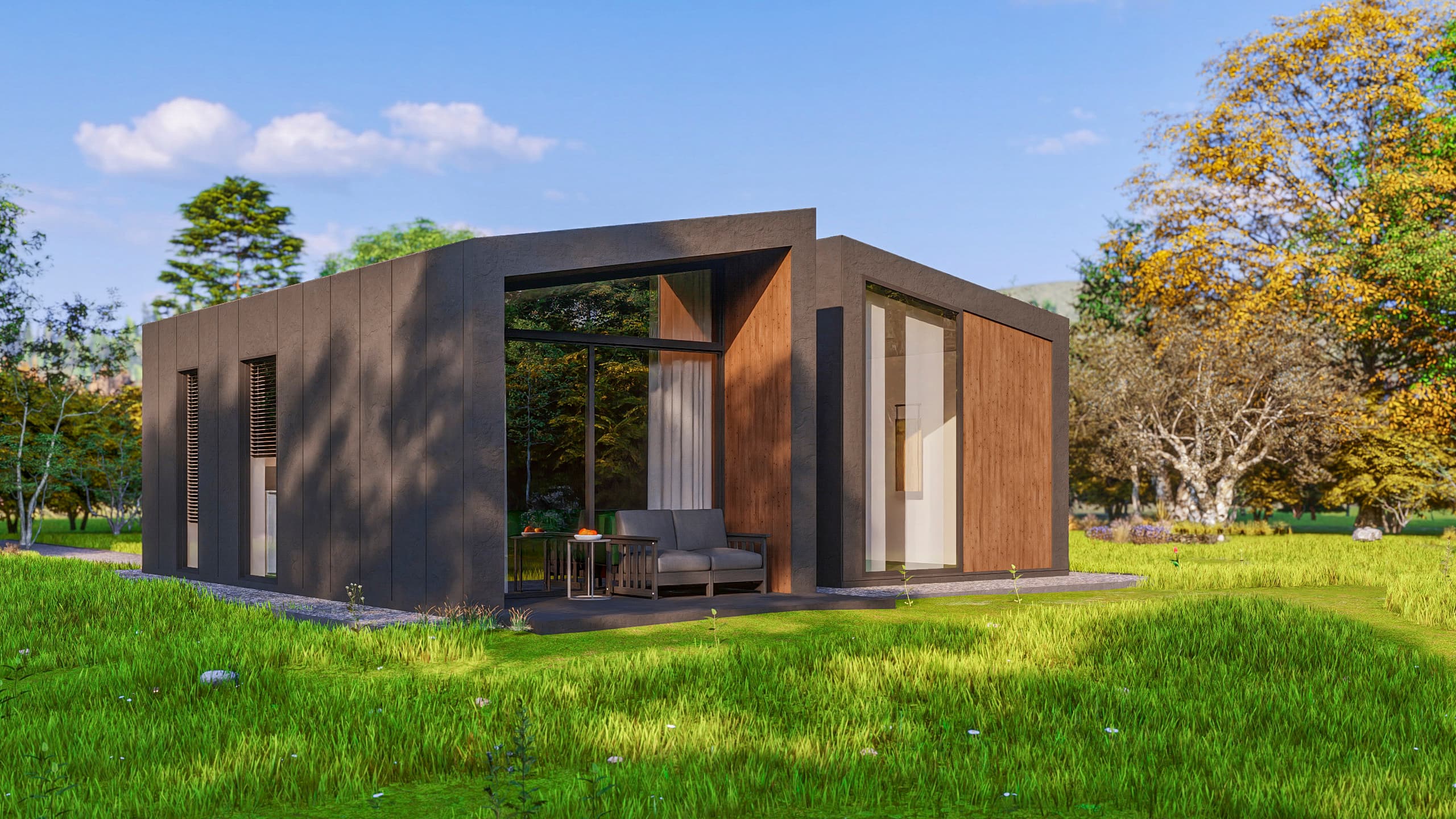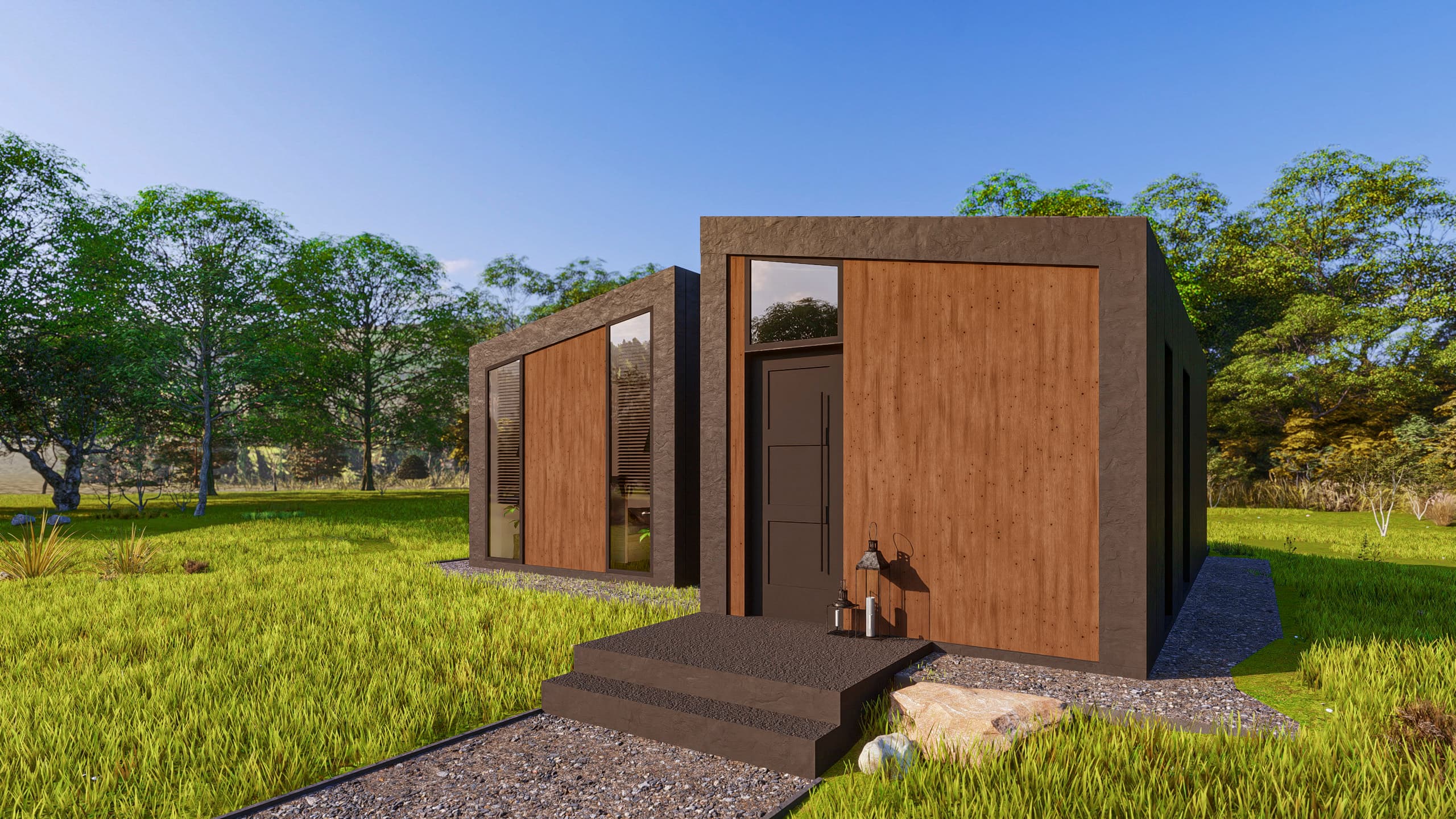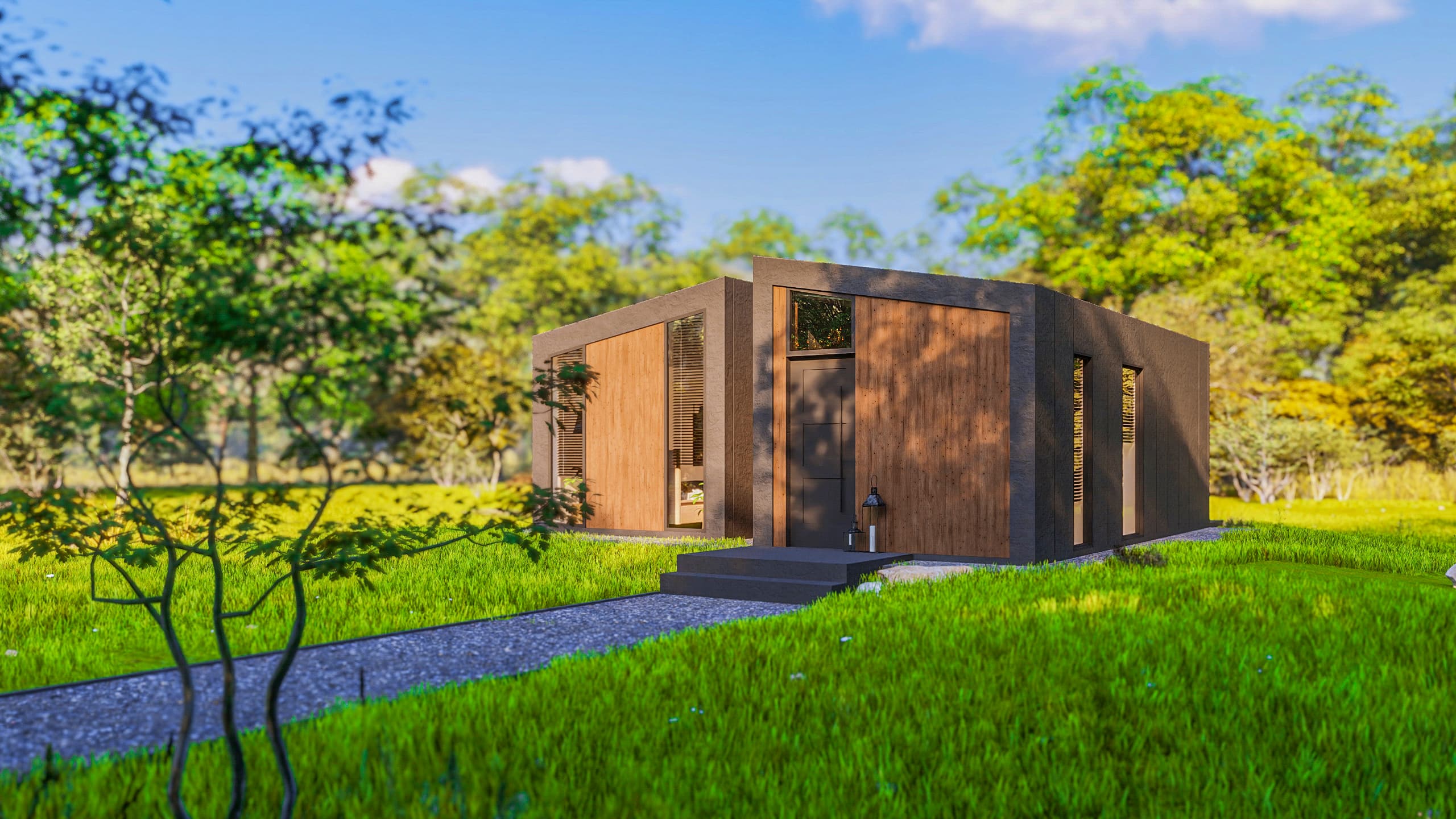 Introducing Lorient, a striking architectural statement where bold geometry meets an intimate connection with nature. This model is defined by its dramatic twin-volume design, featuring a contemporary dark facade contrasted with the organic warmth of natural wood panels.